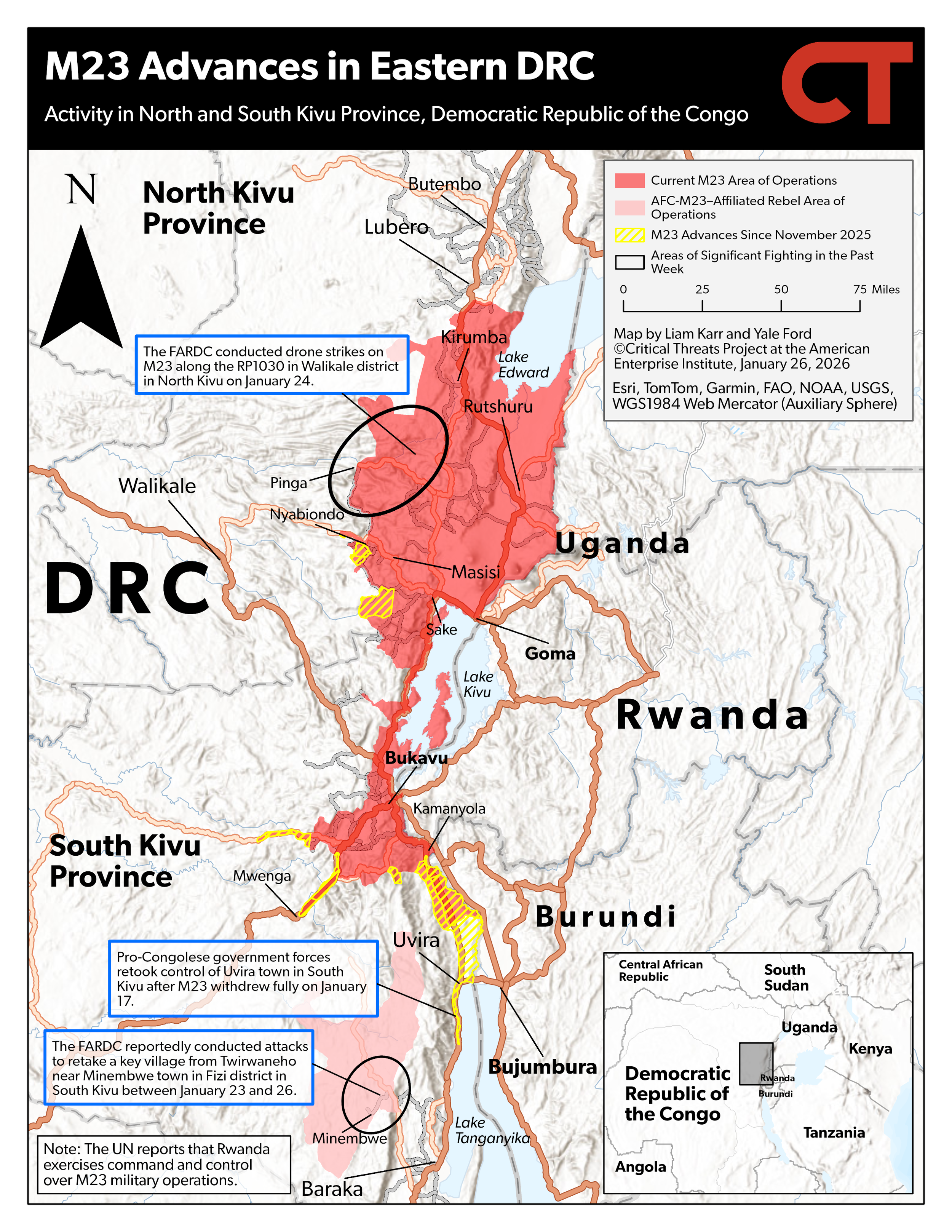 Areas under control of the M23. Credit: Critical Threats Project at the American Enterprise Institute, January 26, 2026